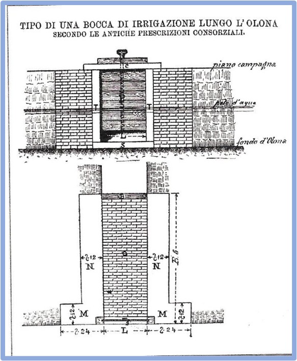 L’acqua non impiegata veniva raccolta in un altro canale (seratore) che la riversava al fiume. Le bocche, normalmente erano larghe 60 cm (un braccio milanese), quelle più strette erano chiamate “bocchelli”