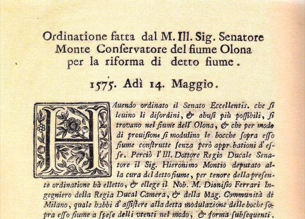 1575 – Il magistrato “Conservatore del fiume Olona” M. Ill. Sig. Senatore Monte (Monti) emette un’altra “grida” 14 maggio, in cui si recita che “ Auendo ordinato il Senato Eccellentis. che si levino li disordini & abusi più possibili si trovano nel fiume Olona, e per modo di previsione si modulino le bocche sopra esso fiume senza però approbazioni d’esse…. elege il Nob. M. Donisio Ferrari, Ingegnero della Regia Ducal Camera & della Mag. Comunità di Milano, quale habbi d’assistere alle detta modulazione delle bocche sopra esso fiume…” Cioè emana disposizioni sulle misure delle bocche e da l’inca-rico al detto ingegnero di verificarne l’applicazione.